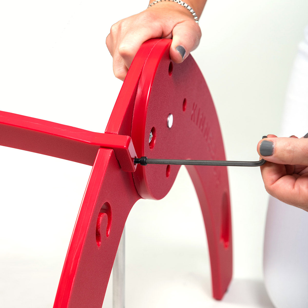 Place the black threaded screws on either end of the top curved plastic crossbar into the pre-drilled holes. Then tighten them with the allen wrench provided in your kit until the screw is flush with plastic. Now your KINNEBAR® should be very stable.