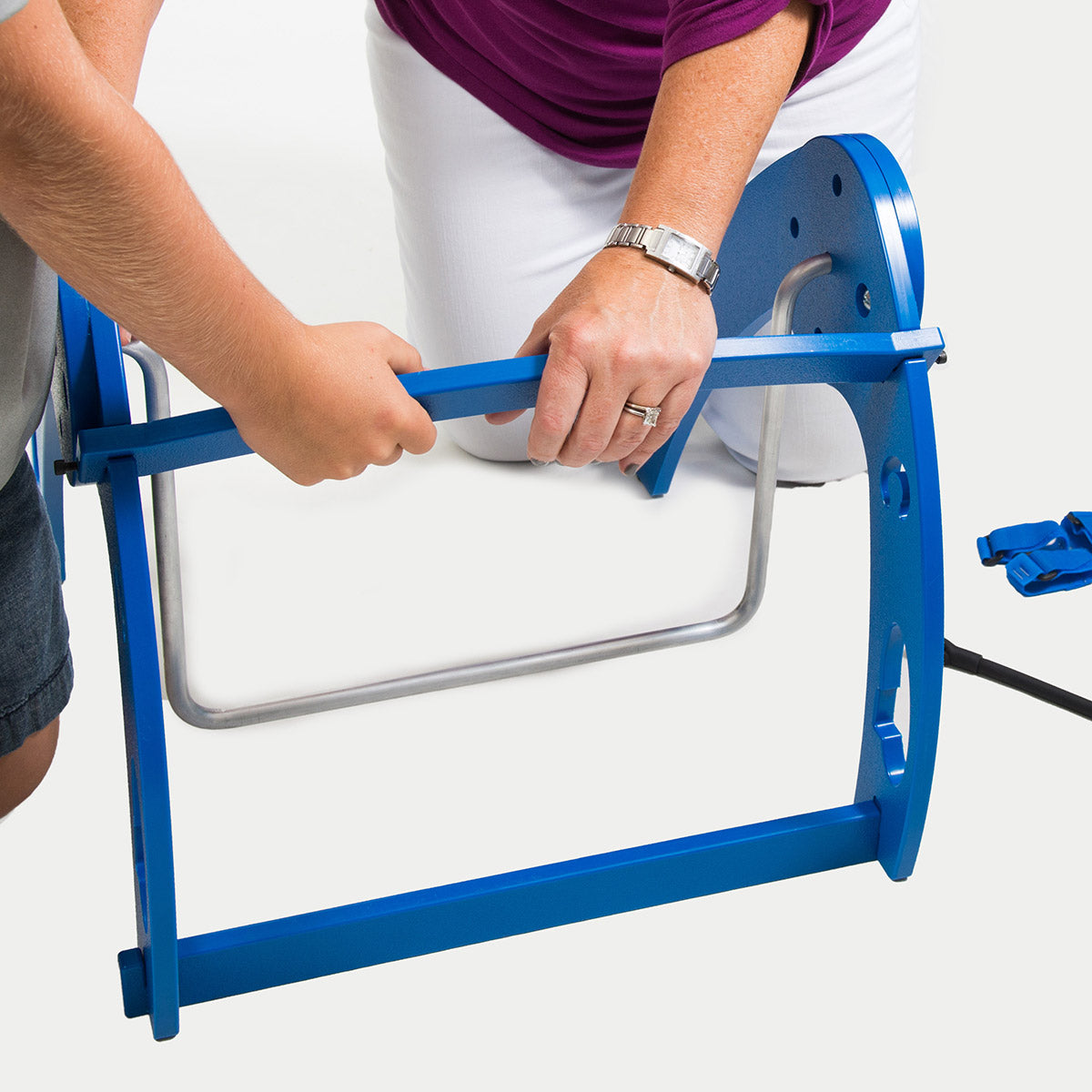 Place the curved plastic crossbar securely across the top portion of the Scissor Legs. Use force to push the crossbar in place. The crossbars are designed to fit tightly.